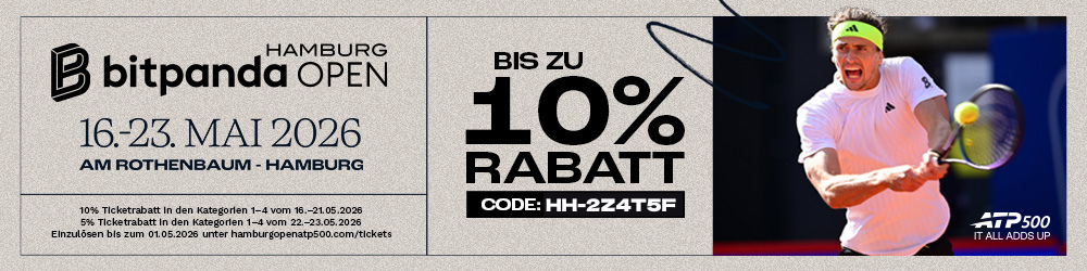 Die Rabattaktion läuft bis zum 15.05.2026 und der Rabattcode kann nur bei Bestellungen über den offiziellen Hamburg Open ATP 500 Onlineshop eingelöst werden.